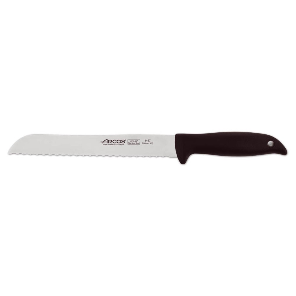 Cuchillo panero de Arcos con la hoja larga y fuerte de acero inoxidable NITRUM®, con filo ondulado y mango de polipropileno, ideal para cortar el pan gracias a sus diente que rompen sin esfuerzo la corteza del pan.