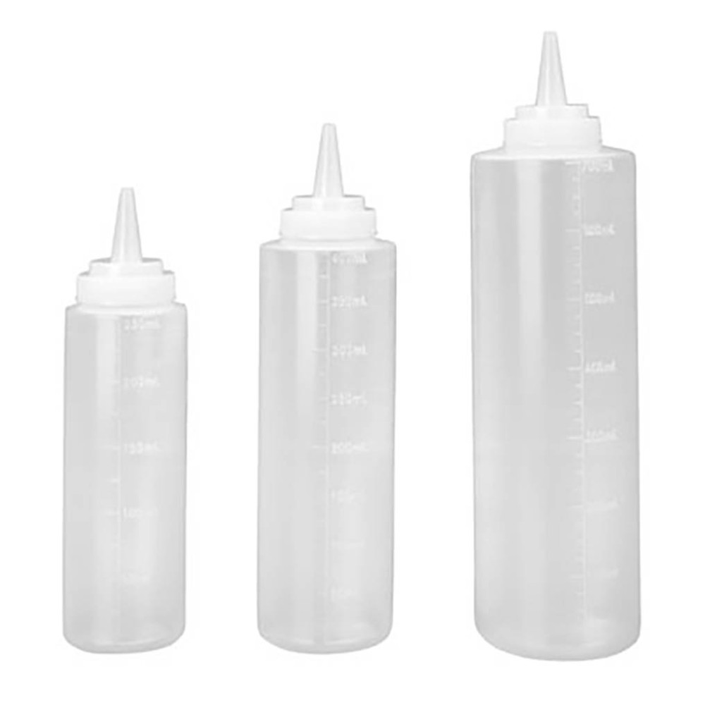 Biberón de cocina transparente con las medidas en relieve. Este biberón es ideal para decorar platos con salsas dulces y saladas, gracias a su color transparente podemos saber el contenido sin necesidad de destaparlo, es super practico para decorar galletas con glasa.