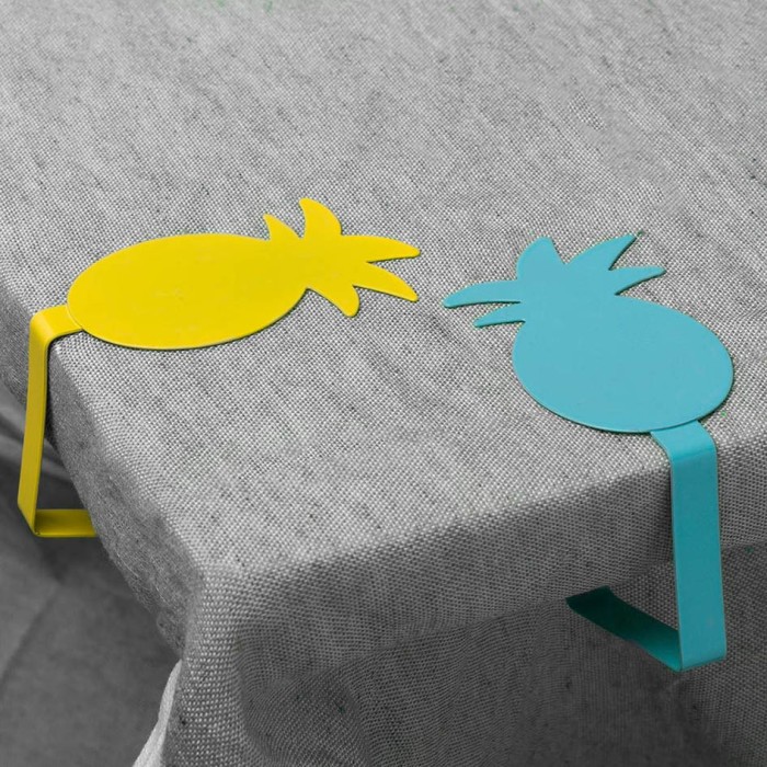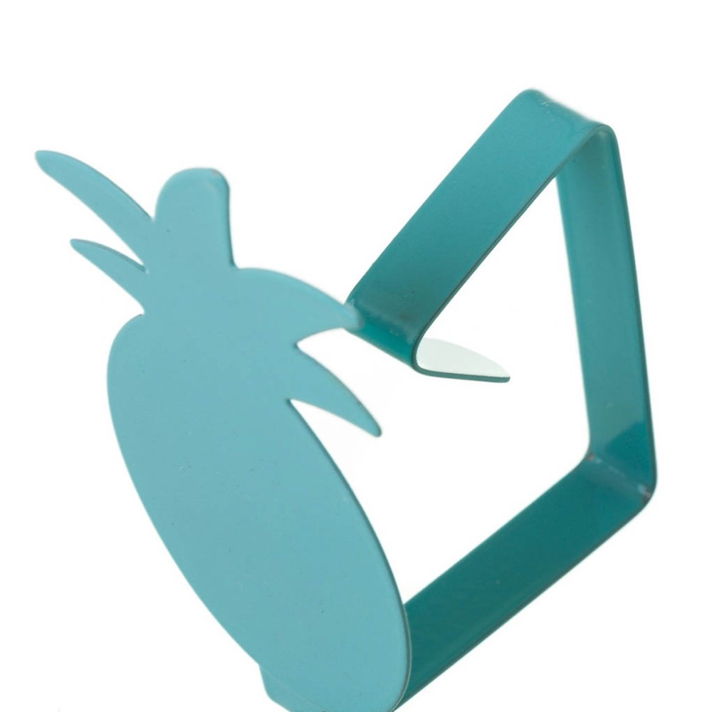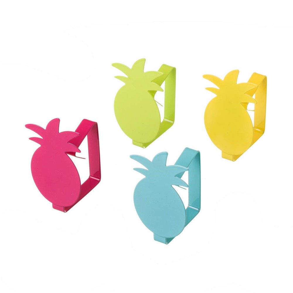 Set de 4 divertidas pinzas sujeta manteles realizadas en metal con forma de piña. Cuatro colores surtidos, verde, amarillo, rosa y azul. Perfectas para sujetar los manteles a la mesa los días de viento, ademas aportan una decoración juvenil y alegre a nuestras mesas.