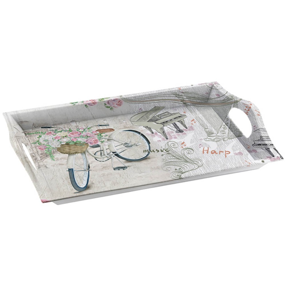 Práctica bandeja de cocina fabricada en melamina de alta calidad, resistente y ligera, decorada con un bonito diseño de una bicicleta con flores. La bandeja lleva dos asas que permiten transportar vasos, platos y demás menaje de una forma cómoda y segura.