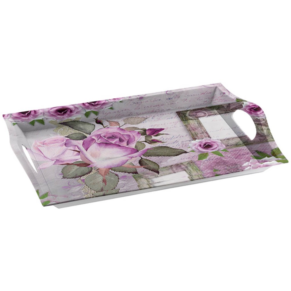 Bandeja fabricada en melamina resistente y ligera, perfecta para su uso en el hogar. La bandeja esta decorada con un maravilloso diseño de rosas en tonos malvas, ideal para recibir a los invitados o para su uso diario, muy práctica para transportar los platos, vajilla y vasos a la mesa.
