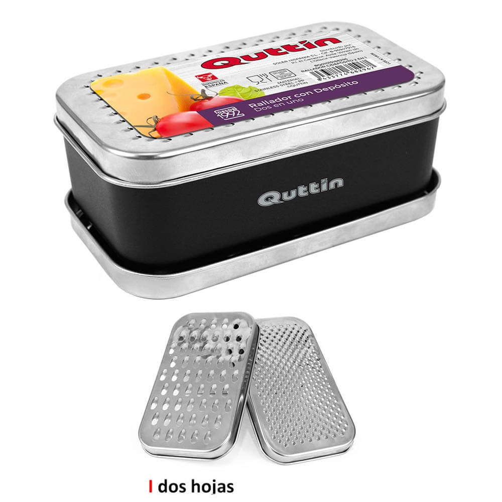 Práctico rallador para queso y verduras con depósito, incluye dos hojas intercambiables con distintos grosores de rallado, fino y laminado.