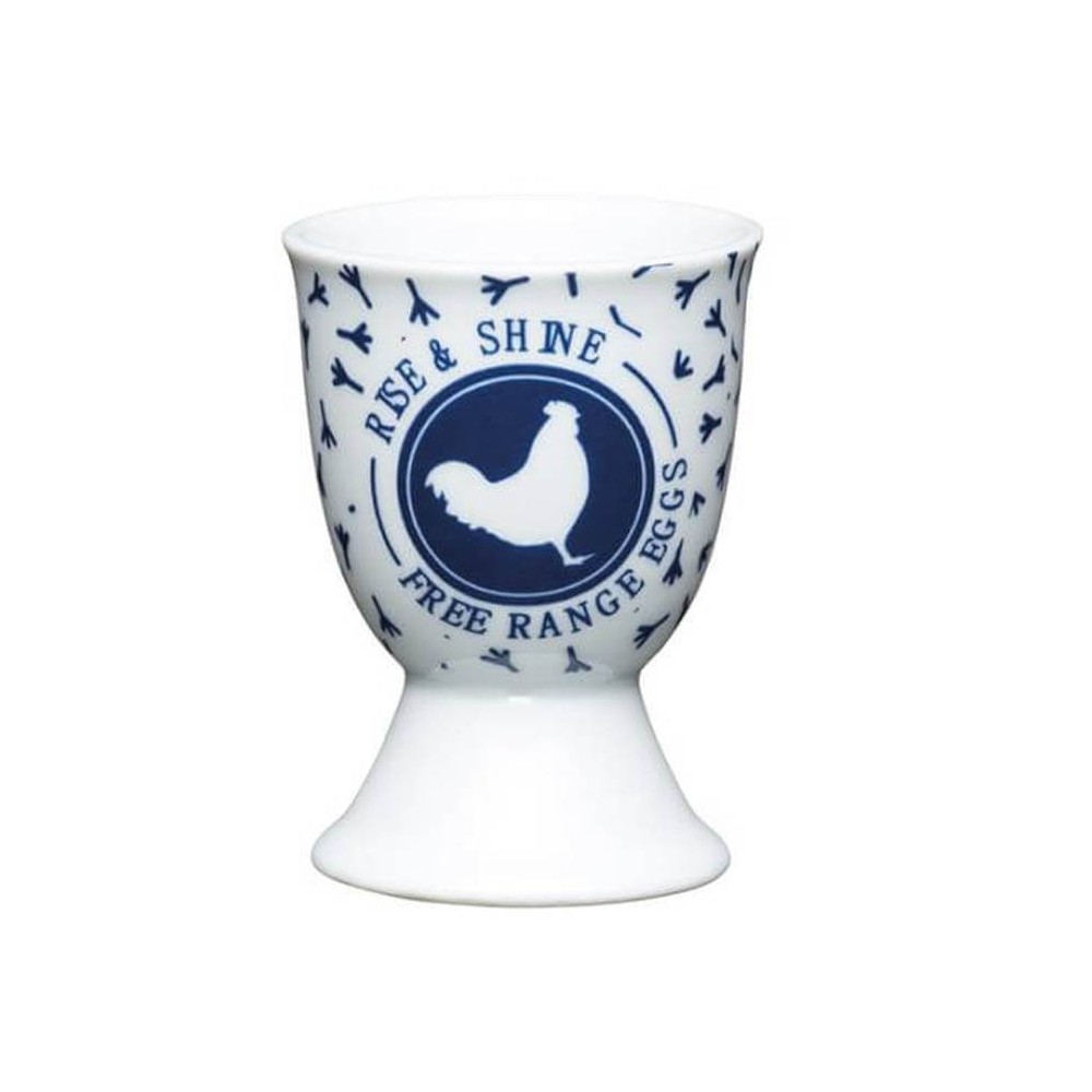 Huevera individual de estilo ingles realizada en porcelana decorada con motivos azules. Esta huevera es perfecta para servir huevos pasados por agua, su forma cóncava permite albergar un huevo con cascara, la base da altura y estabilidad al recipiente.