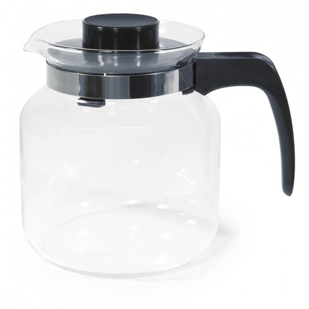 Jarra de 650 ml fabricada en vidrio templado con mango y tapa de plástico negro. La jarra es apta para cocinas de gas, eléctricas y vitro-cerámicas.