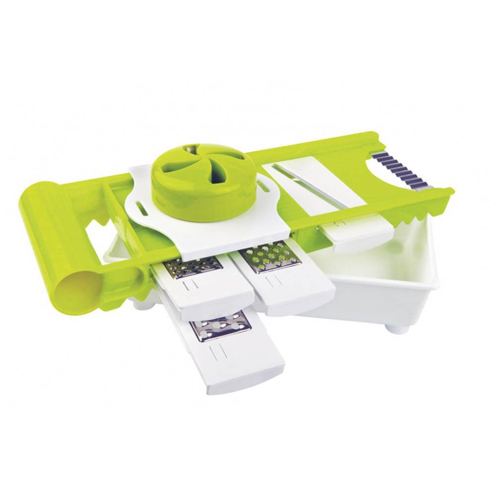 Mandolina de cocina con cuerpo de plástico y 5 cuchillas intercambiables para distintos tipos de corte realizadas en acero inoxidable, podrás rallar o cortar todo tipo de hortalizas, frutas, verduras, quesos y demás alimentos de forma rápida y cómoda. También incluye contenedor para almacenar las cuchillas y para laminar y rallar todos los alimentos en su interior evitando que se ensucie la cocina. Este rallador multiuso no requiere de electricidad.