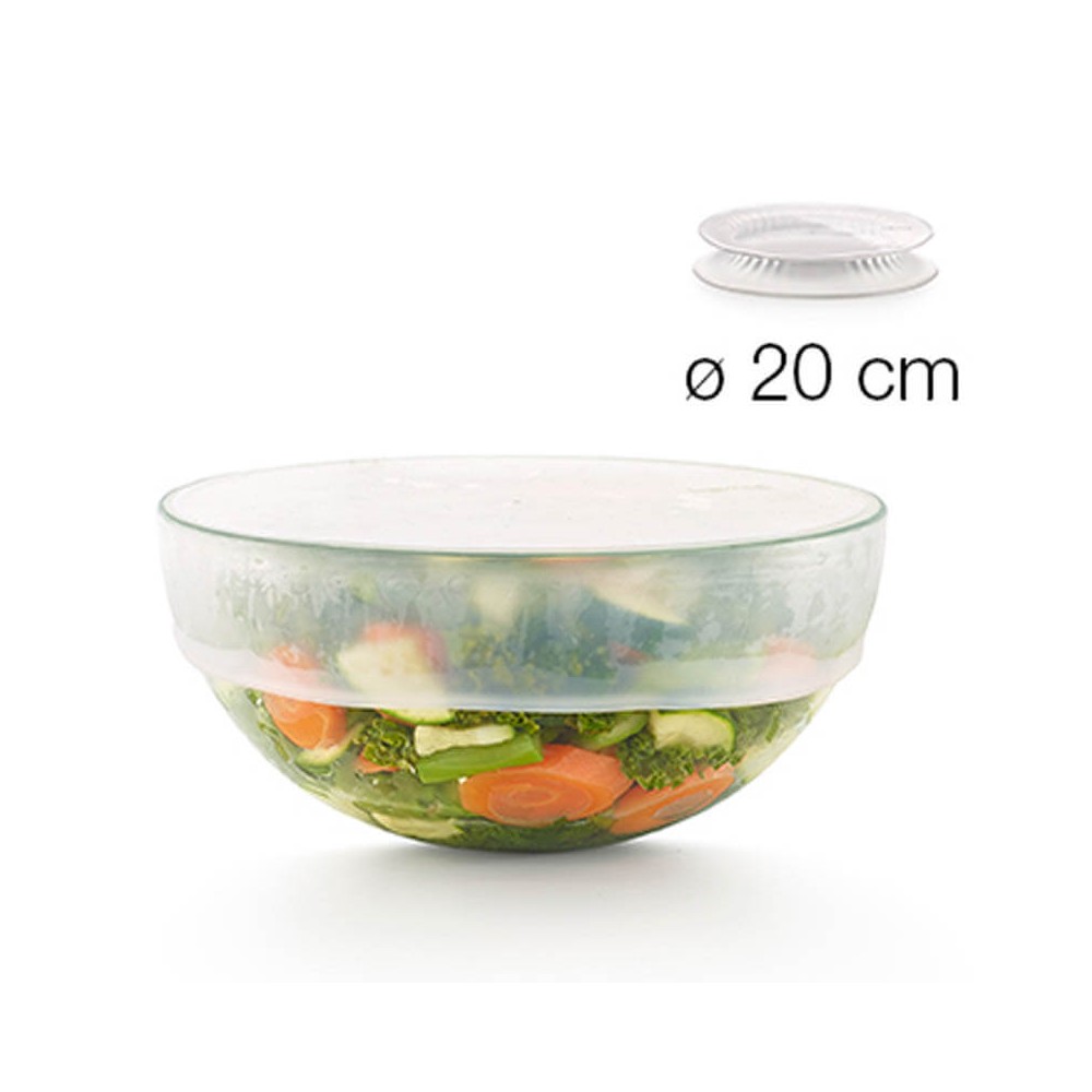 Tapa de silicona extensible de la marca Lékue realizada 100% en silicona platino con 20 cm de diámetro. Las tapas de silicona reutilizables permiten conservar herméticamente los alimentos en la nevera de manera fácil, evitando la contaminación de olores y alargando su frescura.