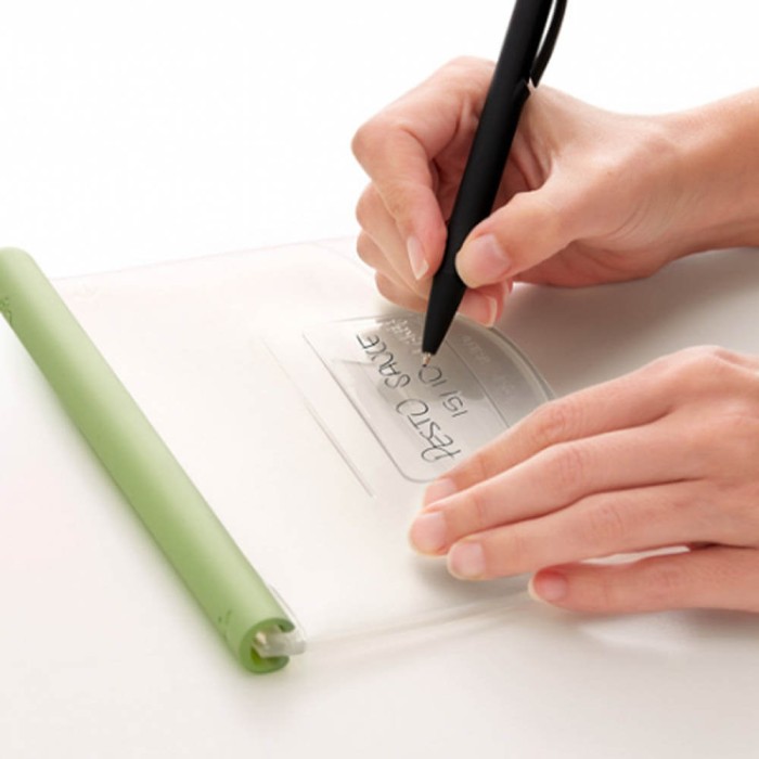 La bolsa de silicona lekue contiene una marca que indica la cantidad máxima hasta la que se debe llenar y un espacio para escribir e indicar el alimento en el interior, fecha de caducidad, etc.