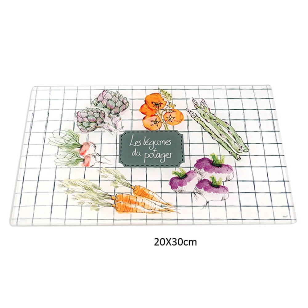 Tabla de corte modelo Potager realizada en cristal decorado con hortalizas sobre una cuadricula. La tabla de cocina esta fabricada en cristal templado, resistente al calor, arañazos y grietas.