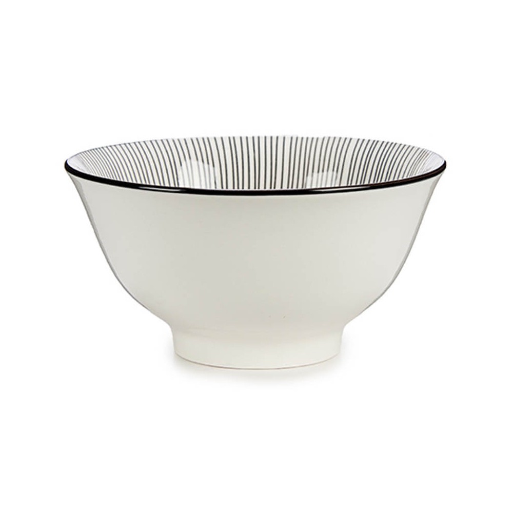 Bowl de cerámica blanco decorado con líneas negras en el interior. Un bol perfecto como bowl de desayuno o bowl para comida en el que se pueden presentar aperitivos en la mesa, también es ideal para servir cremas, gazpachos, sopas y demás alimentos.