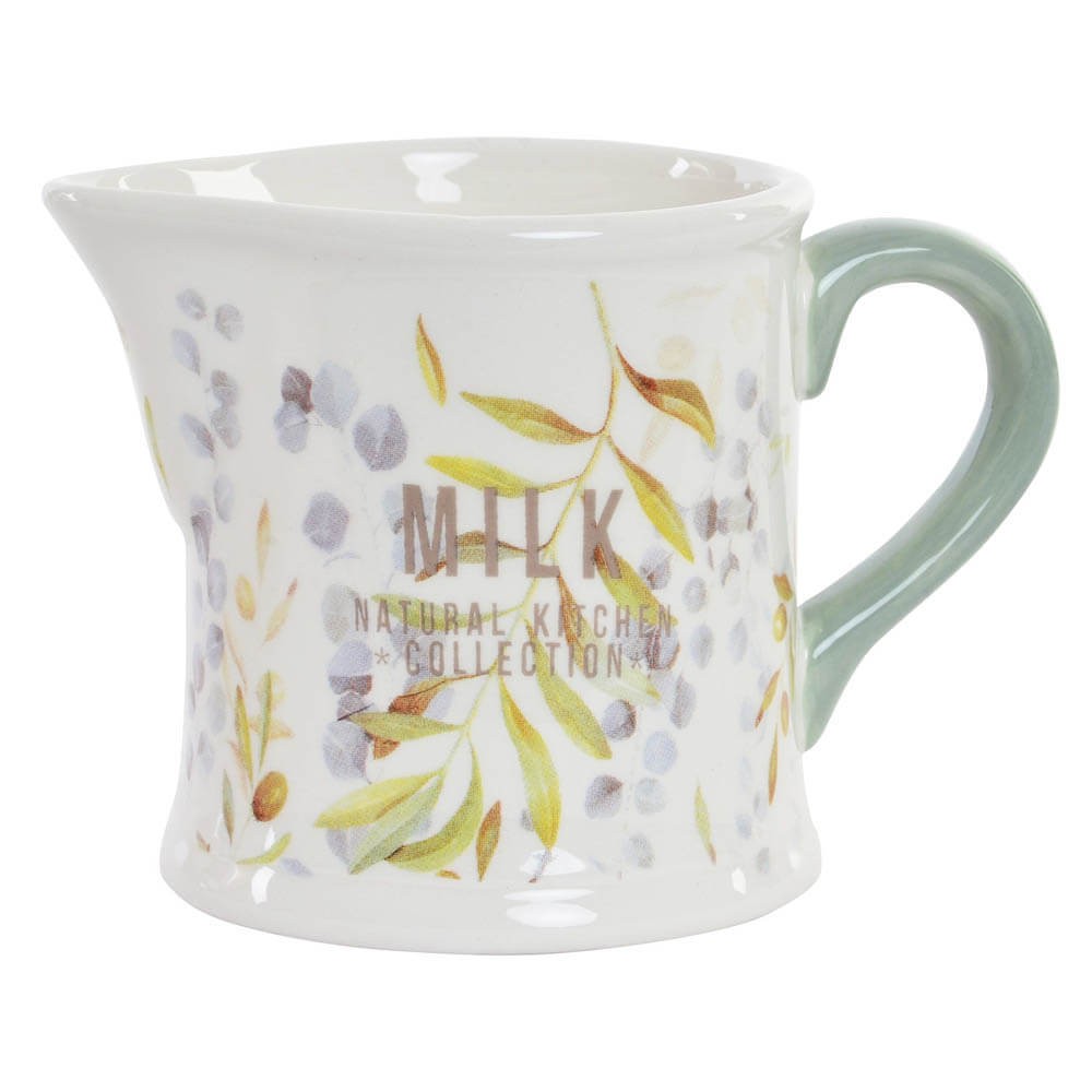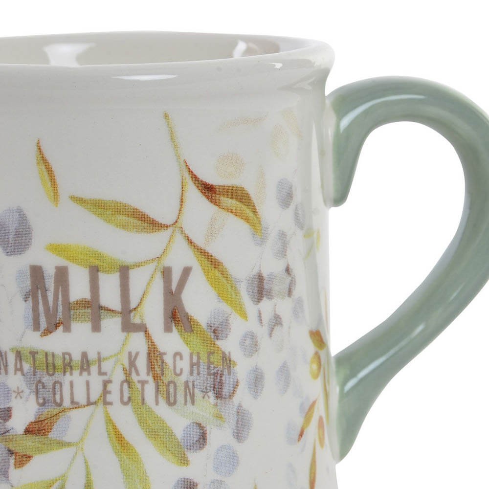 Jarra para leche realizada en cerámica decorada con hojas, muy práctica para llevar leche a la mesa a la hora de la sobremesa. Esta lechera tiene un diseño sencillo, fácilmente combinable con otros accesorios de cocina.