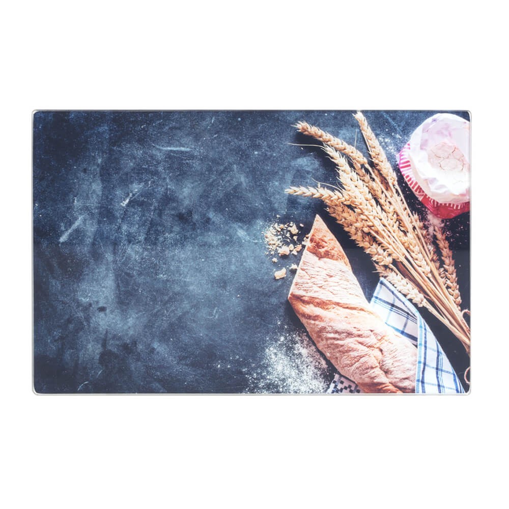 Tabla de corte fabricada en vidrio templado resistente a los golpes de calor, arañazos y grietas, perfecta para cortar y picar todo tipo de alimentos. La tabla para cortar alimentos en formato rectangular tiene un bonito diseño con una barra de pan y espigas de trigo.