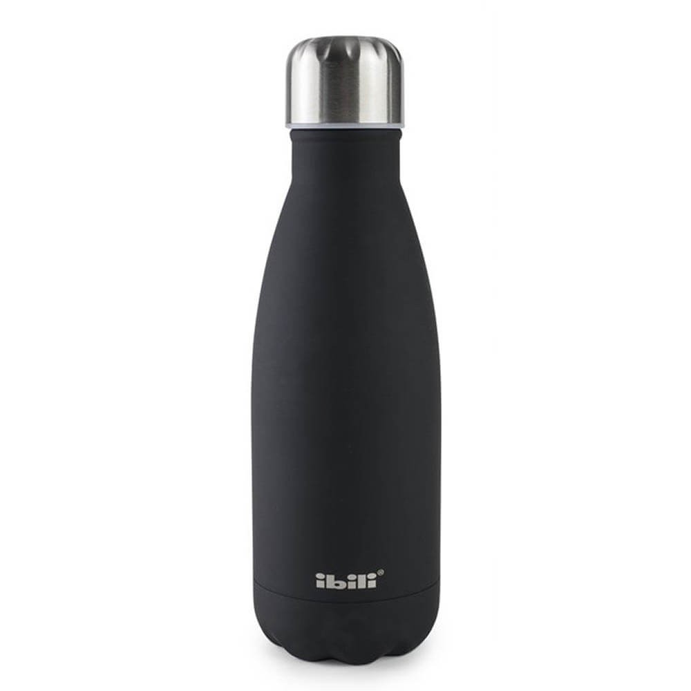 Botella termo color negro fabricada en acero inoxidable con doble pared y cierre hermético,.