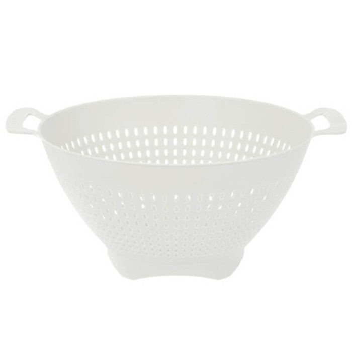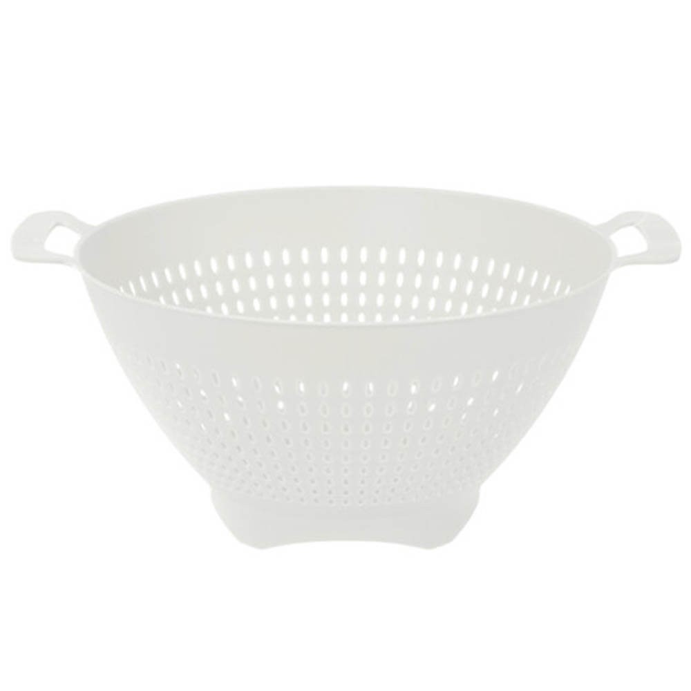 Colador de cocina multiusos fabricado en polipropileno resistente con pequeños agujeros para drenar el agua y separar los alimentos del líquido. Las patas elevadas permiten apoyar el colador dentro del fregadero para filtrar cómodamente el líquido de los alimentos sin tener que estar sujetándolo.