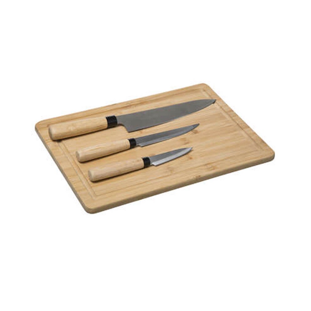 Tabla de corte de bambú con 3 cuchillos con hoja de acero y mango de bambú.