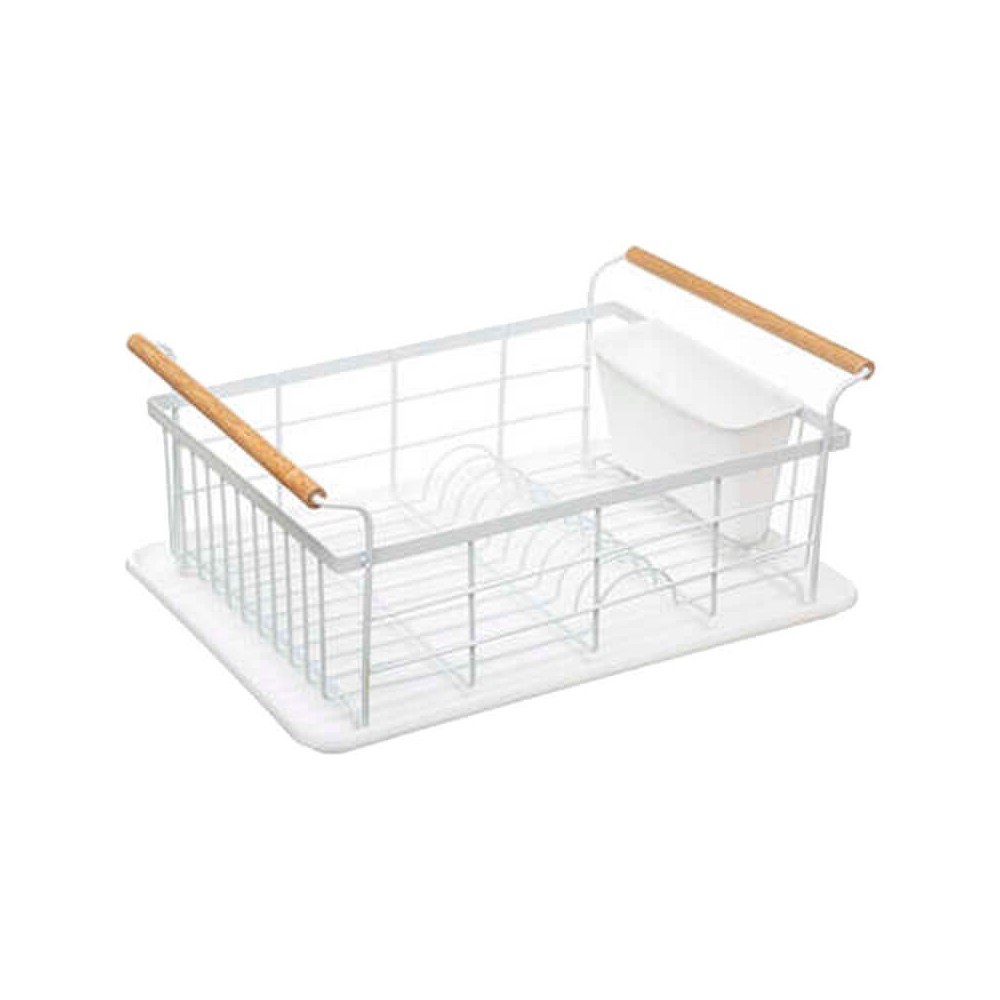 Escurreplatos de cocina tipo cesta con un elegante y moderno diseño fabricado en hierro blanco con asas de madera. Incluye un recipiente para drenar el agua de los cubiertos y una práctica bandeja de plástico para recoger el agua y evitar ensuciar y mojar la encimera.