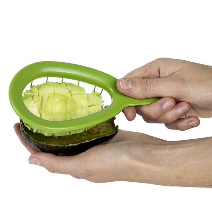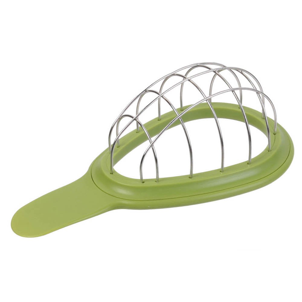 Cortador de aguacates con rejilla de acero inoxidable y mango de PVC verde. Un utensilio de cocina para cortar aguacates en cubos sin necesidad de pelarlo, fácil y rápido.