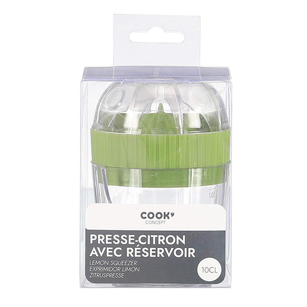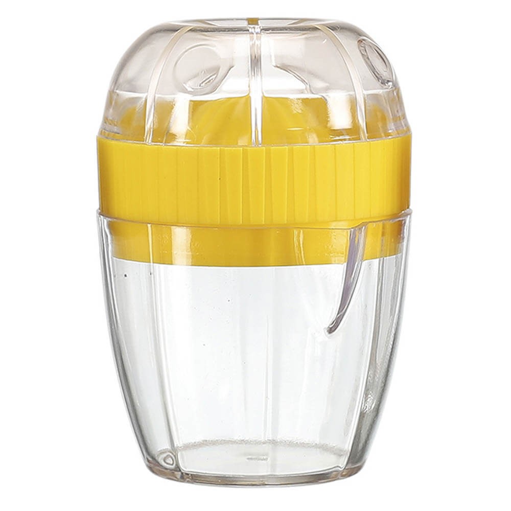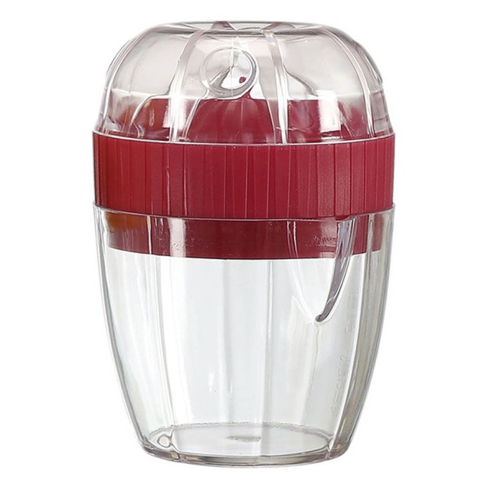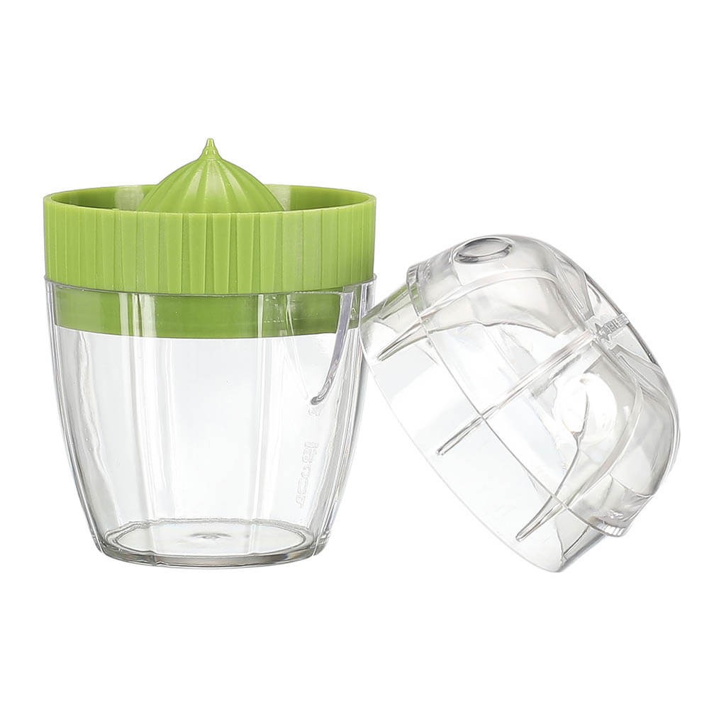 Exprimidor manual de cítricos con deposito transparente con marcas en centilitros, cuenta con pico vertedor para evitar derramar nada.