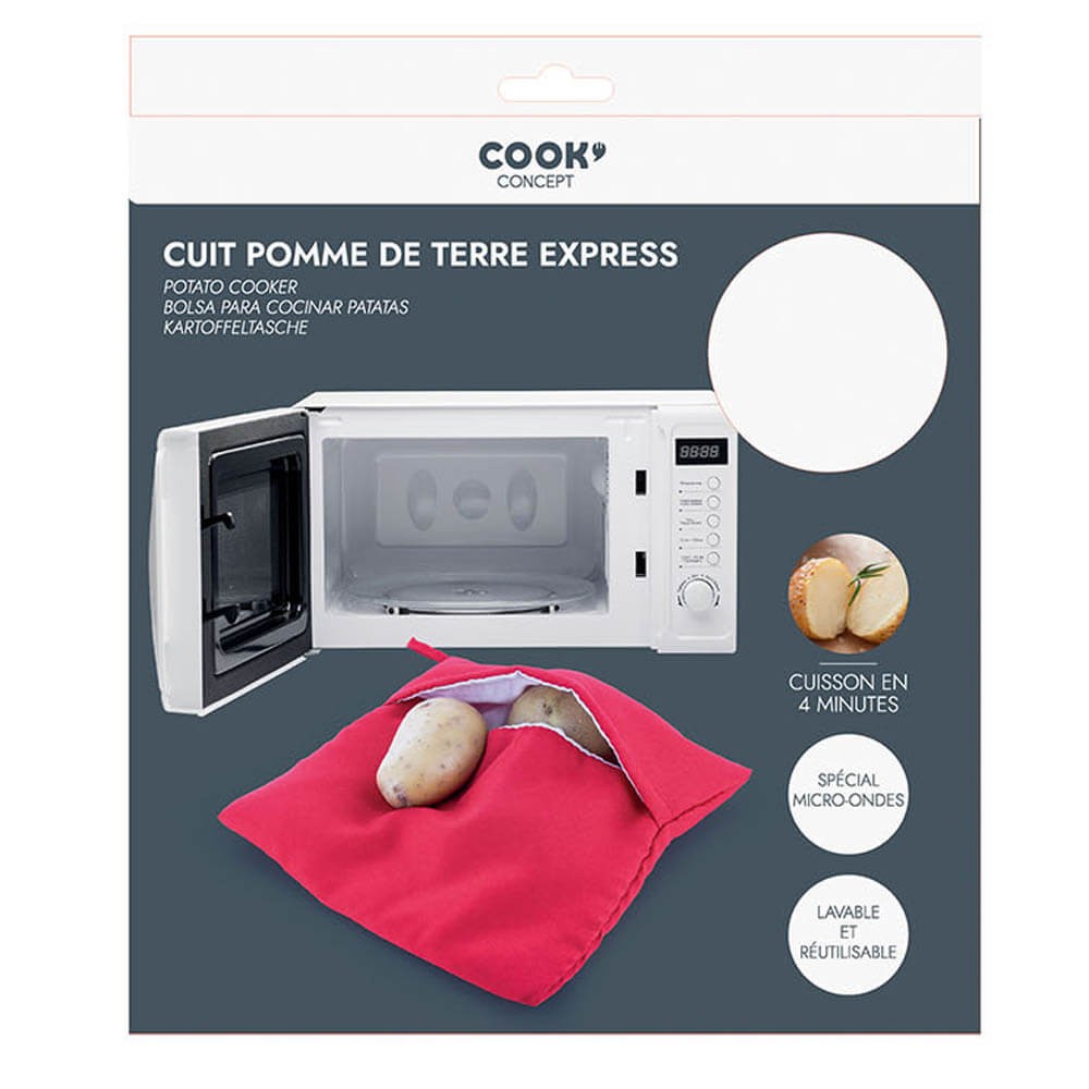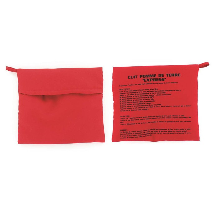 Instrucciones de uso: introduzca de 1 a 4 patatas en la bolsa y colóquela dentro del microondas, caliente durante 4 minutos entre 600W y 700W. Retire delicadamente las patatas de la bolsa.