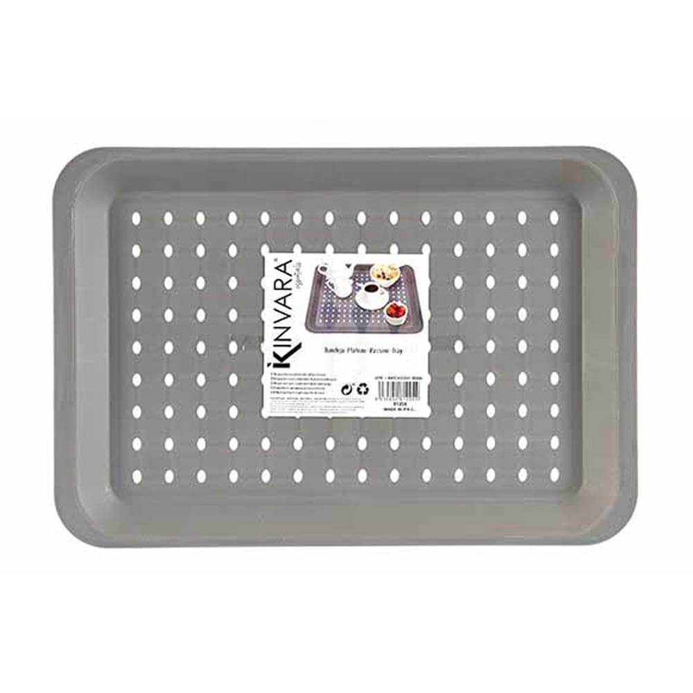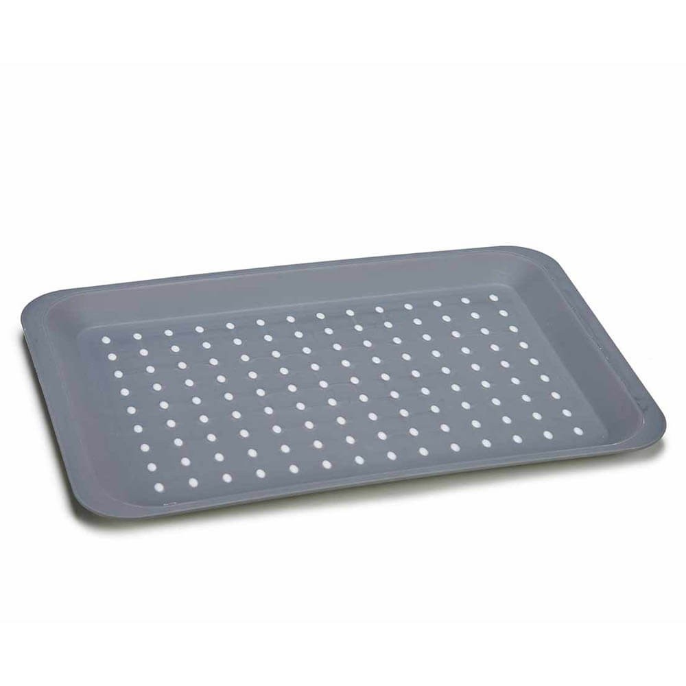Bandeja de cocina rectangular fabricada en plástico resistente con los bordes ligeramente elevados y la base con puntos antideslizantes.