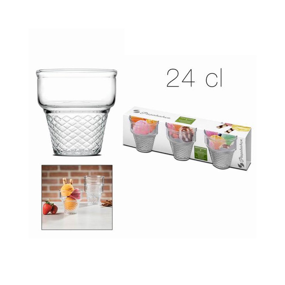 Conjunto de 3 vasos para helado de 24cl realizados en cristal transparente con un original diseño de cucurucho, perfectos para servir en la mesa de forma individual helados cremosos.