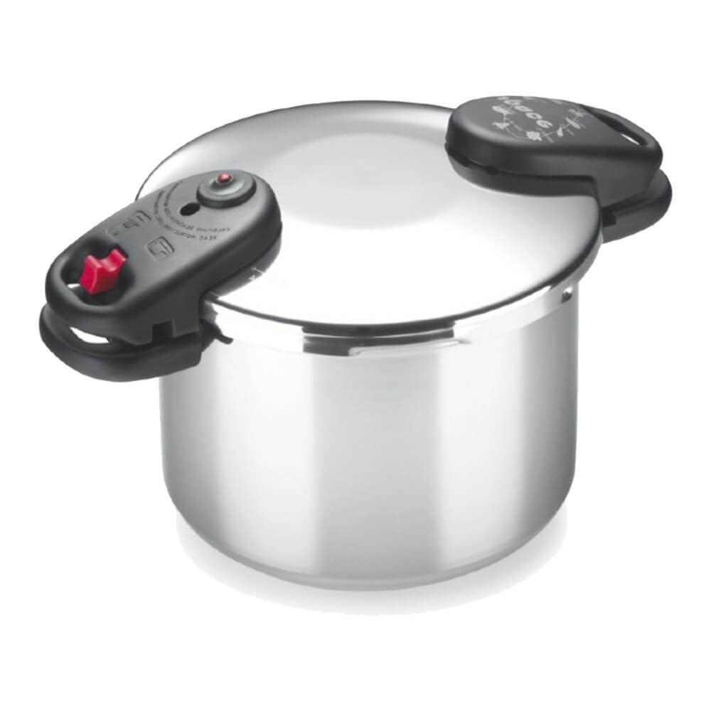 Fabricada íntegramente en Acero Inoxidable 18/10, con asas de baquelita con un diseño de doble asa enfrentada para ahorrar espacio de almacenaje en la cocina, junta de cierre de silicona, e indicador de presión de Aluminio anodizado.
