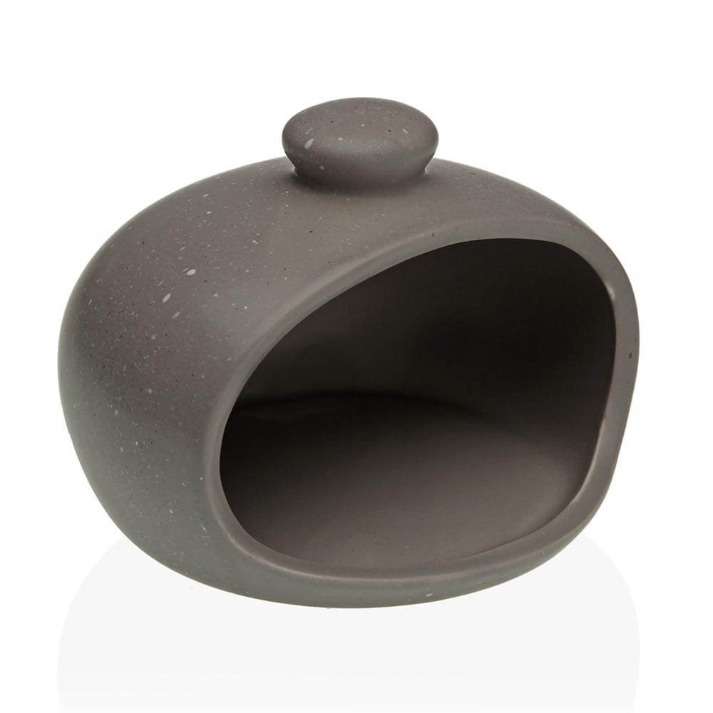 El porta estropajos para fregadero esta realizado cerámica de color gris con acabado moteado, tiene un diseño sencillo con formas redondeadas y tirador para agarrarlo cómodamente.