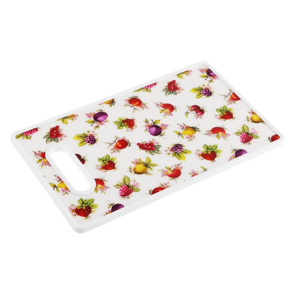 Tabla de corte realizada en polipropileno decorado con un bonito diseño de frutas, material higiénico y antibacteriano para que piques y cortes los alimentos con seguridad.