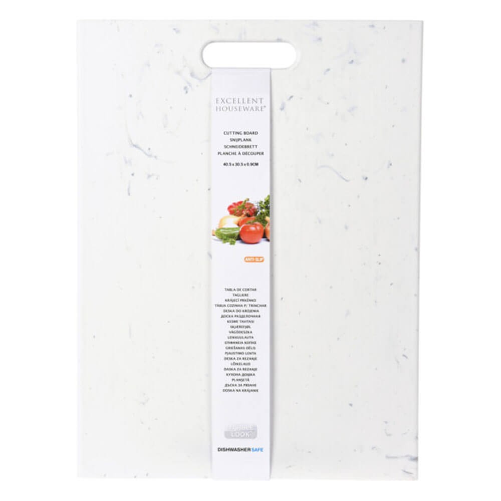 Tabla de corte realizada en polipropileno, material higiénico y antibacteriano con un moderno diseño acabado mármol, perfecta para que piques y cortes los alimentos con seguridad.