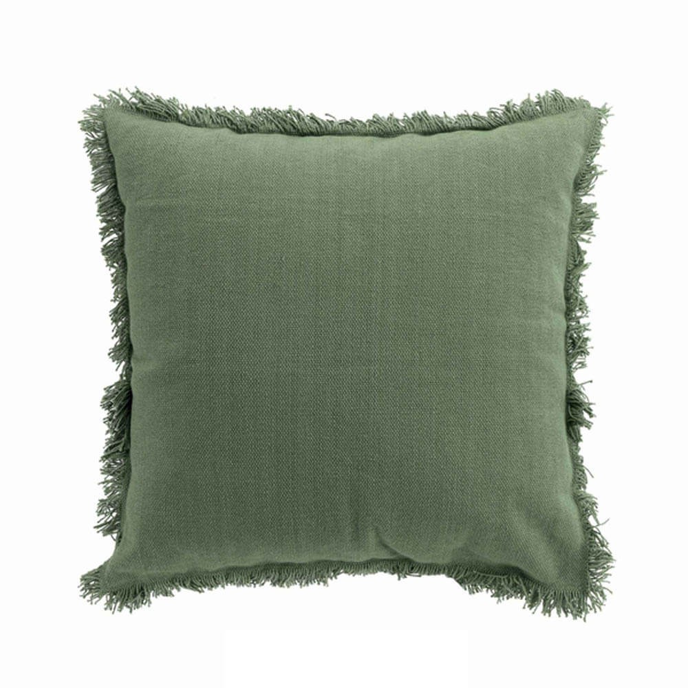 Cojín decorativo confeccionado en tejido resistente de algodón 100% de color verde con flecos en los extremos, ideal para salón o terraza.