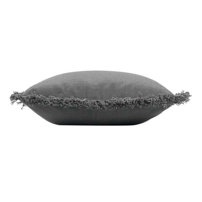 Cojín decorativo confeccionado en tejido resistente de algodón 100% de color gris con flecos en los extremos, ideal para salón o terraza.