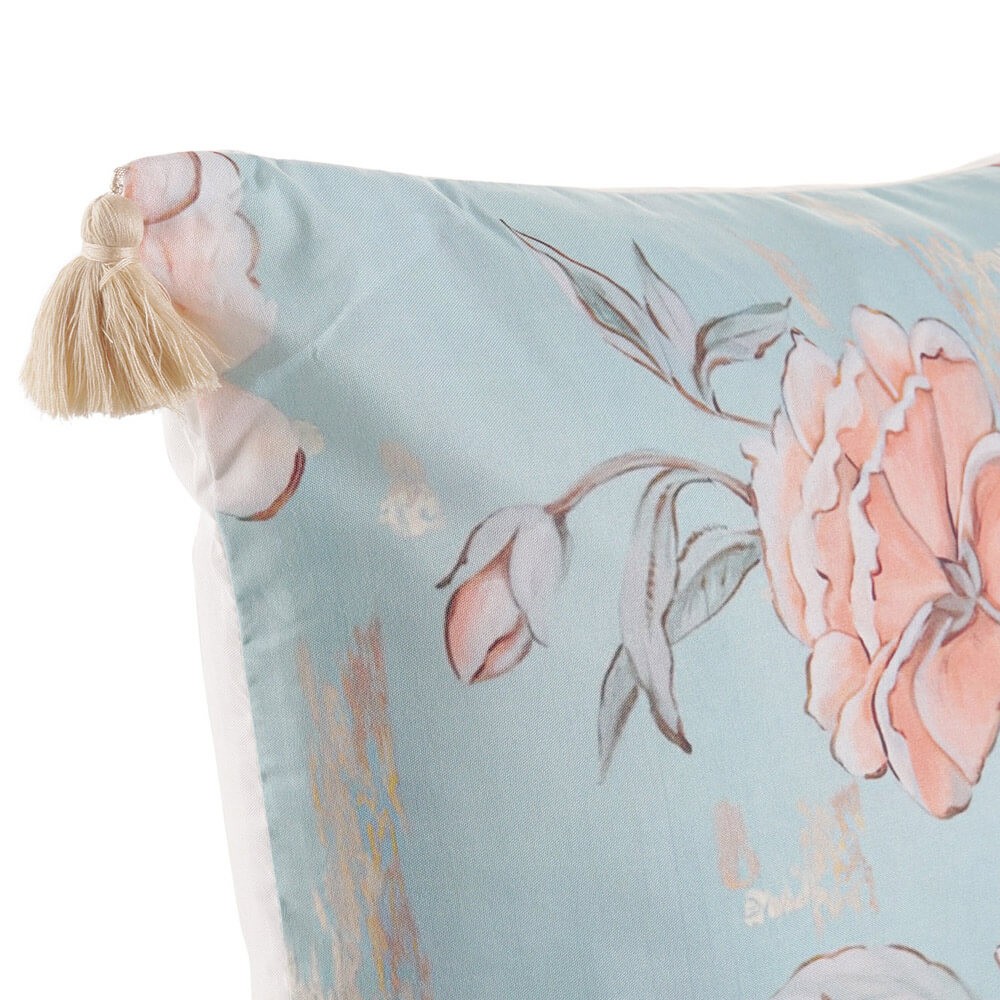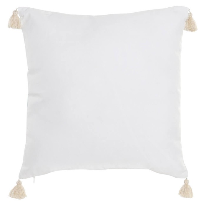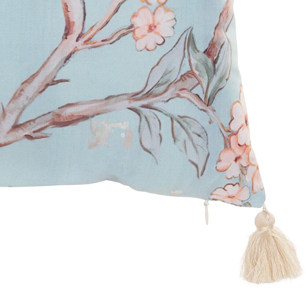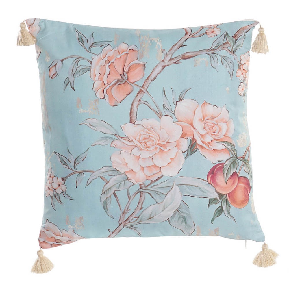 Cojín decorativo de estilo clásico confeccionado en tejido de poliéster de tacto agradable con 4 borlas en color crudo, lleva una cara estampada con flores, ramas y frutos sobre fondo azul cielo y la otra en color crudo. 2 modelos según disponibilidad.