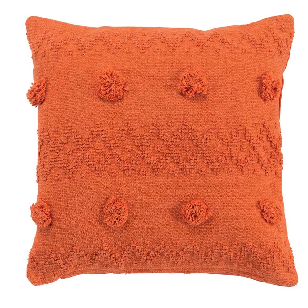 Cojín decorativo de 40x40 cm confeccionado en tejido resistente de algodón 100% con cierre de cremallera. Diseño de estilo boho en color naranja con dibujos y pompones en relieve, perfecto para terraza o salón. La funda lleva el reverso en color liso.