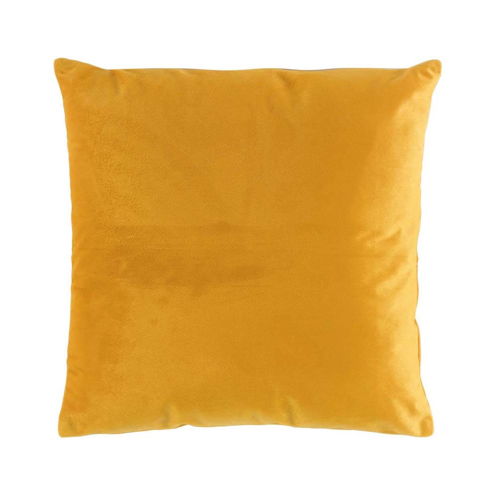 Cojín decorativo con funda confeccionada en tejido de terciopelo 100% poliéster en color amarillo mostaza, ideal para añadir un toque de color y suavidad a la decoración del salón o dormitorio.