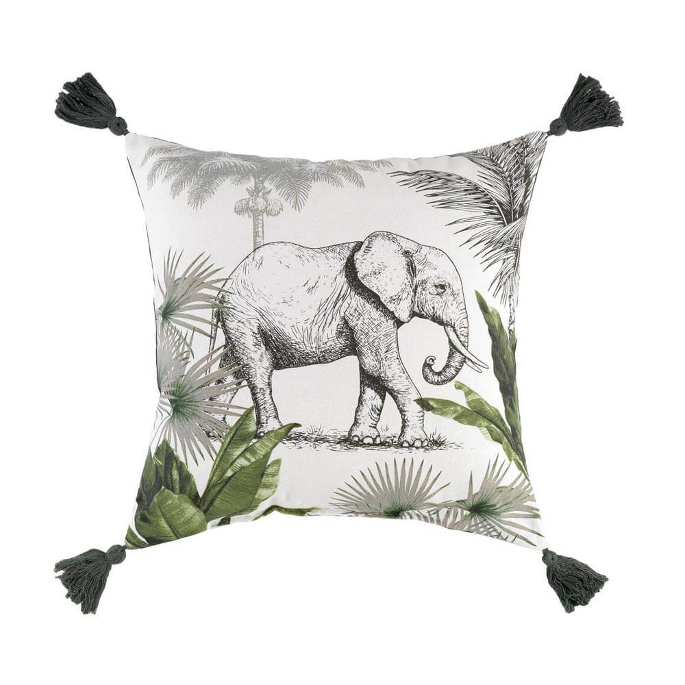 Cojín decorativo con funda de algodón estampada con un bonito diseño de estilo tropical en tonos verdes con borlas decorativas en las esquinas, ideal para dar estilo a la casa. El cojín lleva el reverso en color liso verde y el anverso estampado con un elefante y plantas tropicales.