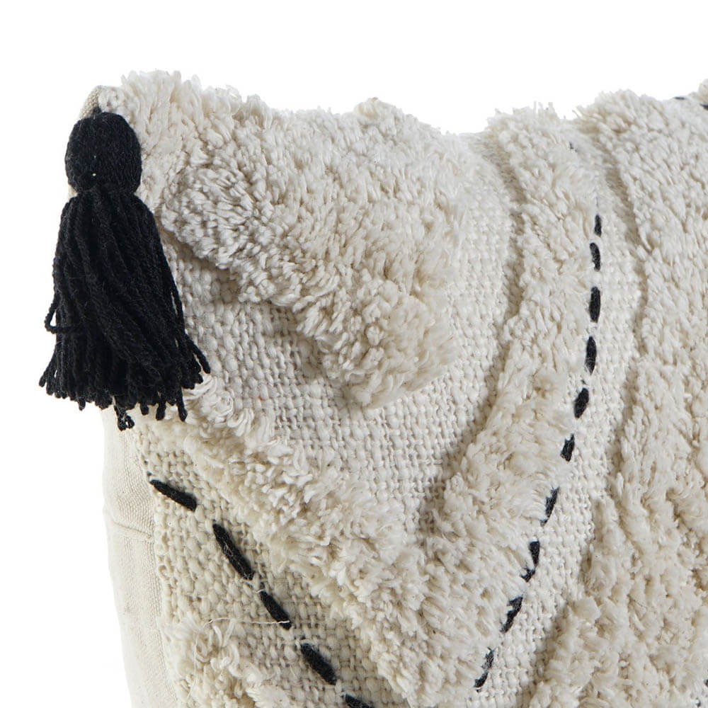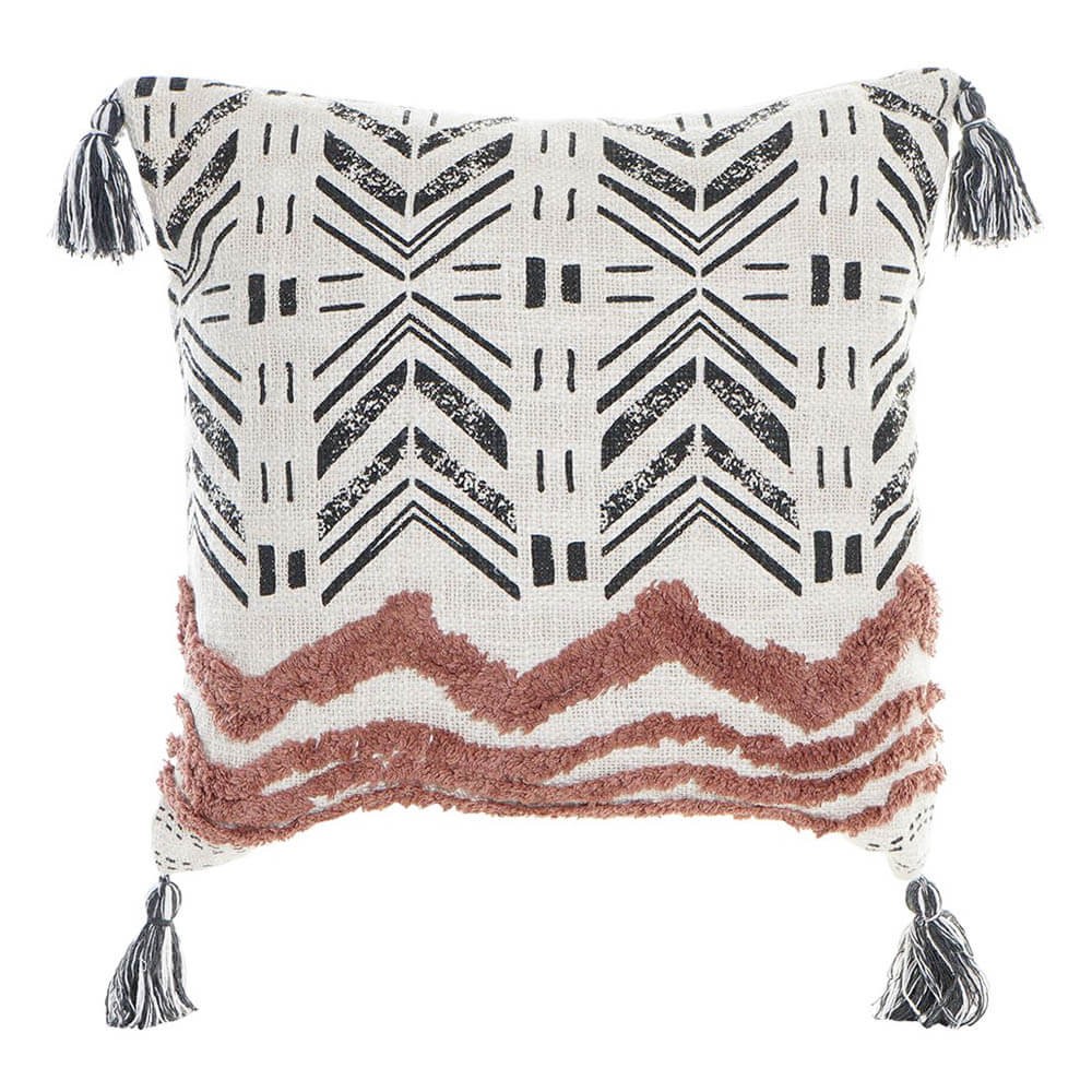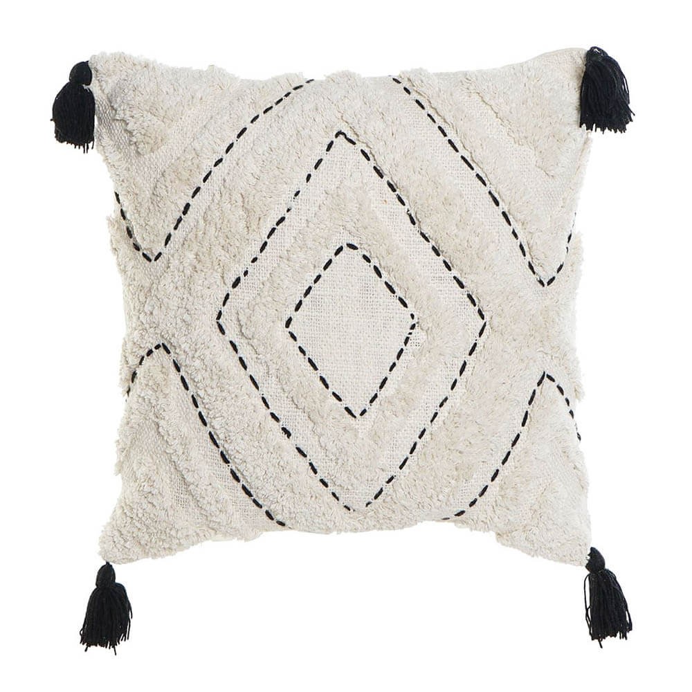 Cojín decorativo de 45x45 cm con funda confeccionada en tejido de algodón resistente con cierre de cremallera, diseño de estilo boho con borlas en las esquinas, 2 modelos, rombos en color crudo con pespunte negro o dibujos impresos con hilos en relieve caldera y reverso liso.