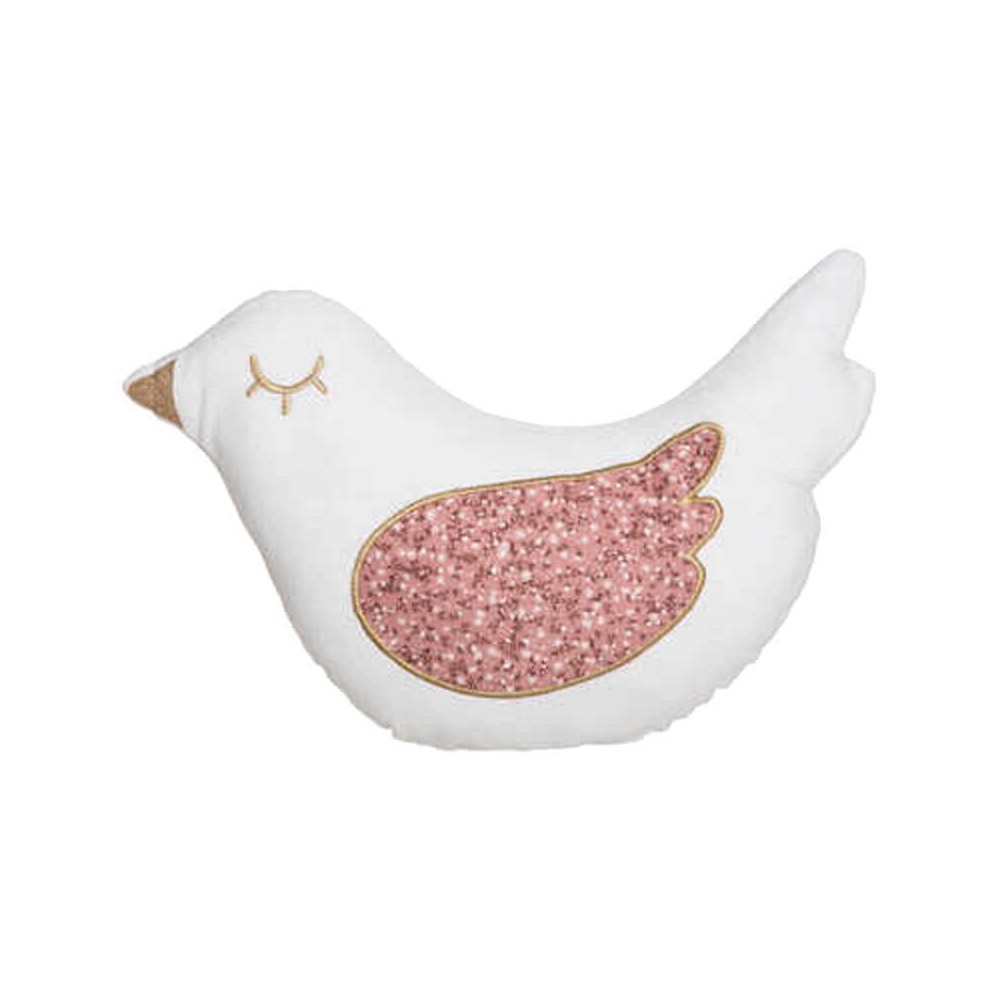 Cojín infantil con relleno en forma de pájaro confeccionado en tejido de poliéster de tacto aterciopelado, suave y agradable en color blanco decorado con detalles bordados en hilo dorado y tejido liberty de flores rosas. Ambos lados son iguales.