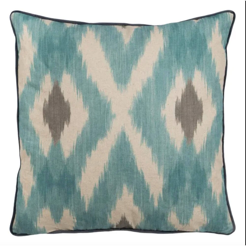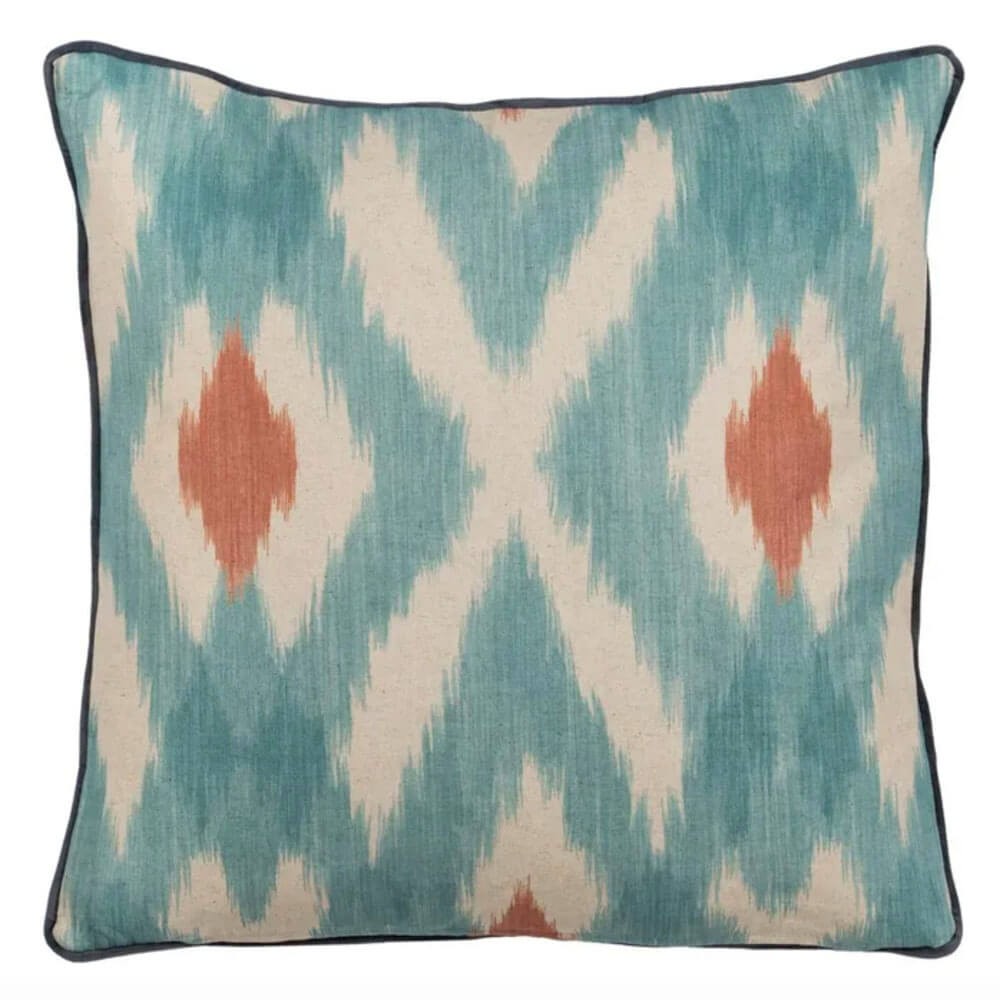 Si estas cansad@ de la decoración de tu salón o tienes que renovar tus cojines por que están viejos o anticuados sustitúyelos por este cojín decorativo confeccionado en lino y poliéster, tiene un bonito estampado de estilo étnico en tonos azules con una cara con pinceladas en naranja y la otra grises para que lo gires según tu estado de ánimo, ideal para que aportes a tu salón un toque relajado y elegante y un extra de confort a tu sofá.