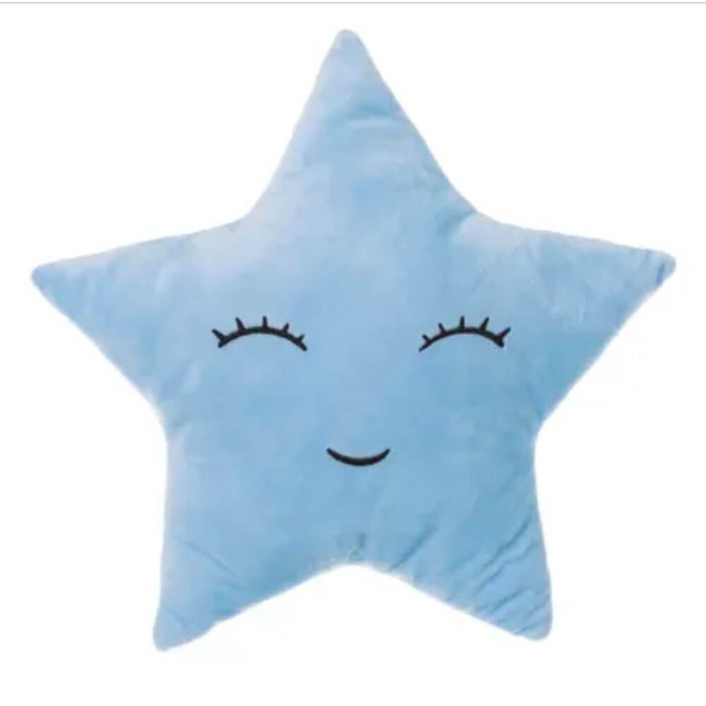 Cojín infantil con relleno en forma de estrella confeccionado en tejido de poliéster de tacto aterciopelado en color azul, o gris.