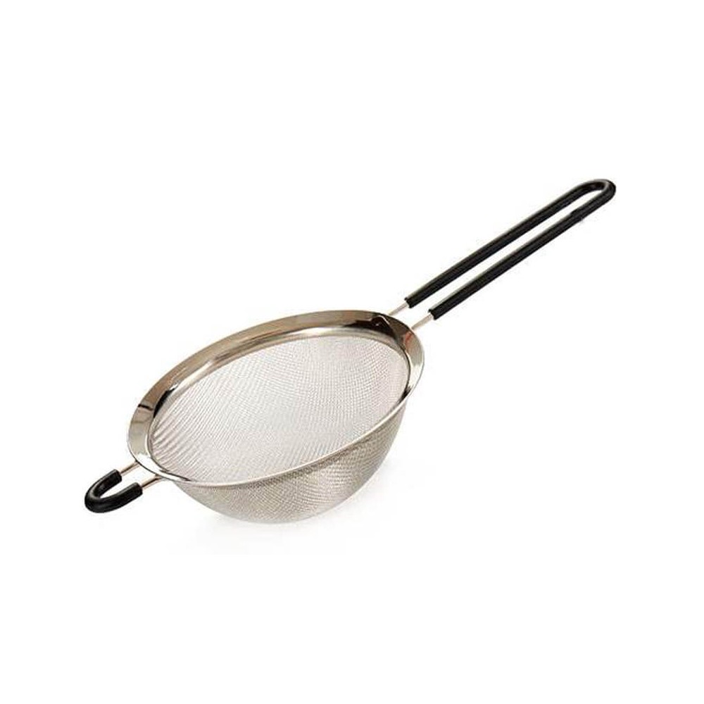 Colador de malla fina de 16cm de diámetro fabricado en acero con mango recubierto de silicona negra antideslizante, súper práctico para separar los alimentos sólidos de los líquidos.
