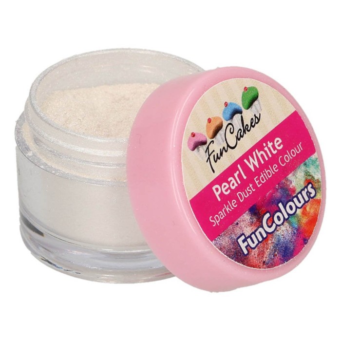 Purpurina comestible de la gama Sparkle Dust de la marca FunCakes en color blanco, perfecta para añadir un sutil brillo blanco perlado a las tartas y pasteles. Realza tus creaciones al pincelar con un poco de purpurina en polvo o añadir detalles sobre las tartas, flores de azúcar y demás decoraciones.