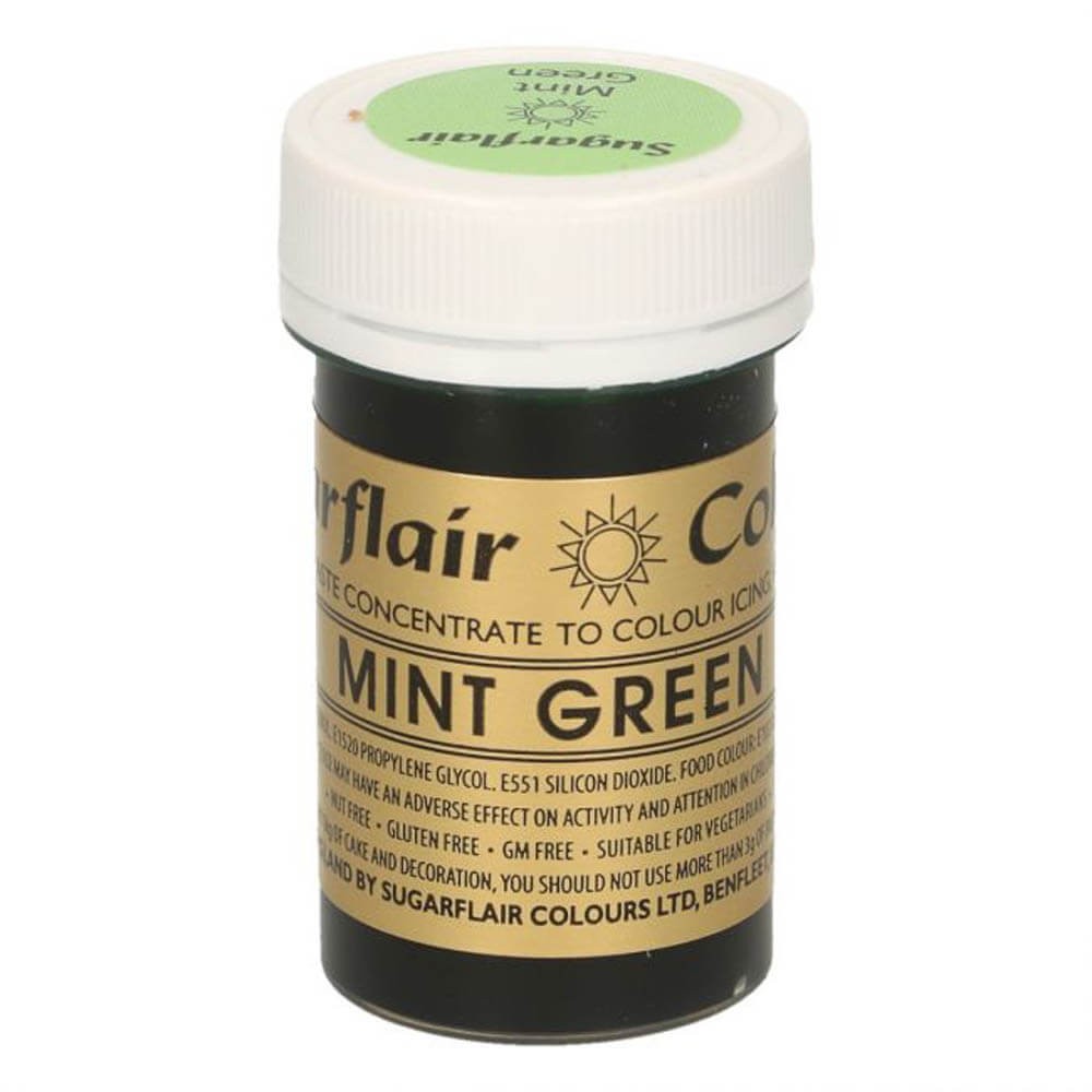 Colorante alimentario de la linea Spectral Concentrated Paste de Sugarflair en color verde menta con consistencia en pasta, perfecto para teñir y colorear mazapán, fondant, pasta de modelar, pasta de flores, Royal Icing, buttercream, masas saladas y todo tipo de alimentos a base de agua.
