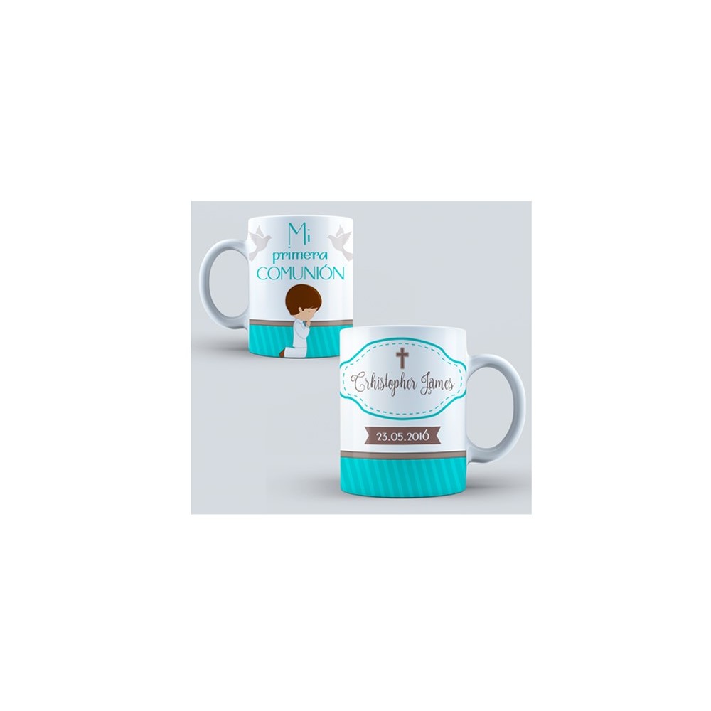 El atractivo diseño en color blanco, azul y marrón de la taza crea un ambiente dulce y elegante. En un lateral, encontrarás una ilustración encantadora de una niño vestido de comunión rezando, en la parte superior dos palomas, símbolo de paz y pureza recogiendo la frase "Mi primera Comunión" que destaca con elegancia y devoción.