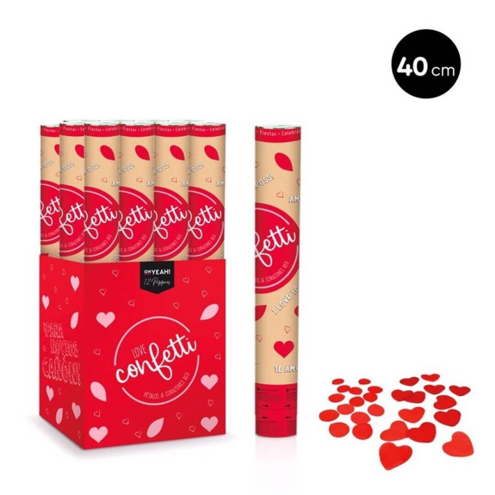 Cañón con confetti de pétalos y corazones, ideal para fiestas y eventos con temática de amor.