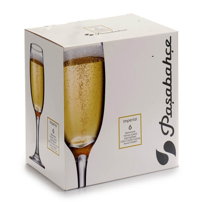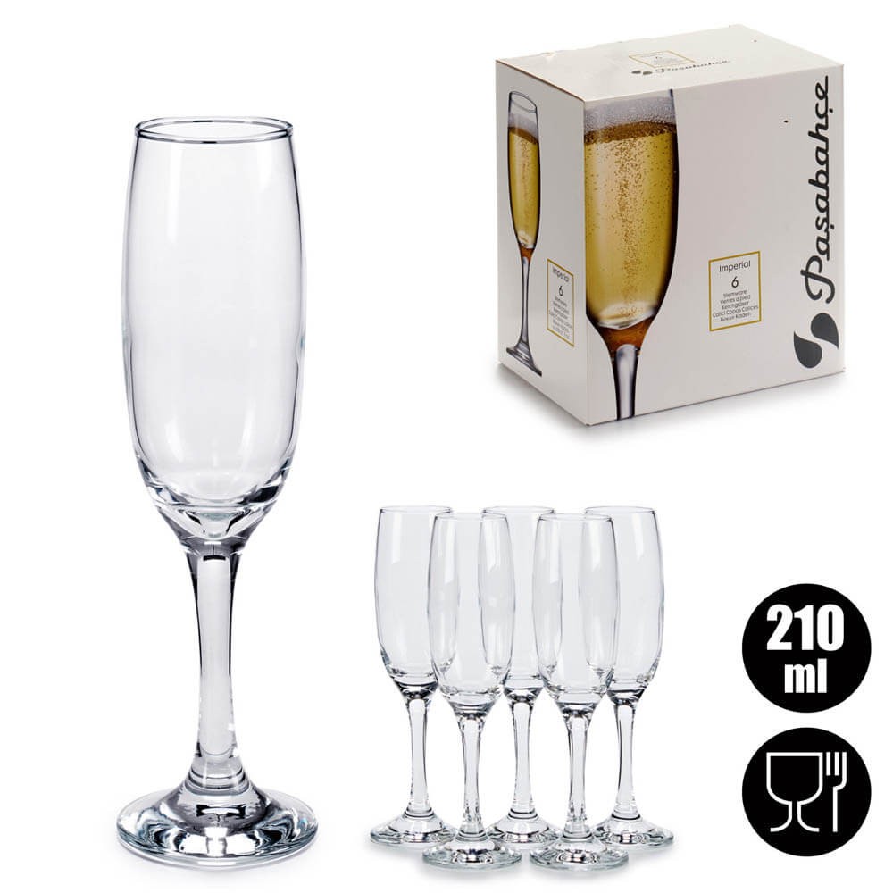 Caja con 6 copas de champan o cava modelo Imperial con 21cl de capacidad, realizadas en vidrio transparente de gran resistencia de la marca Pasabahce con un diseño clásico en forma de flauta, perfectas para aportar un toque de distinción a la mesa. El cristal transparente permite ver las burbujas de la bebida y su coloración.