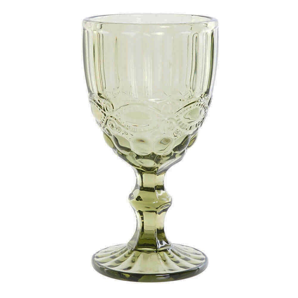 Copa de vino con tallo corto y cáliz grabado realizada en vidrio tintado de color verde con un bonito diseño de estilo clásico en tendencia, perfecta para uso diario o para ocasiones especiales.