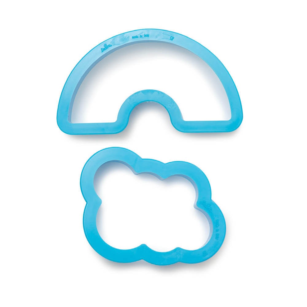 Un set de cortadores de plástico para que realices divertidas galletas en forma de arcoíris y nube, perfecto para fiestas infantiles.