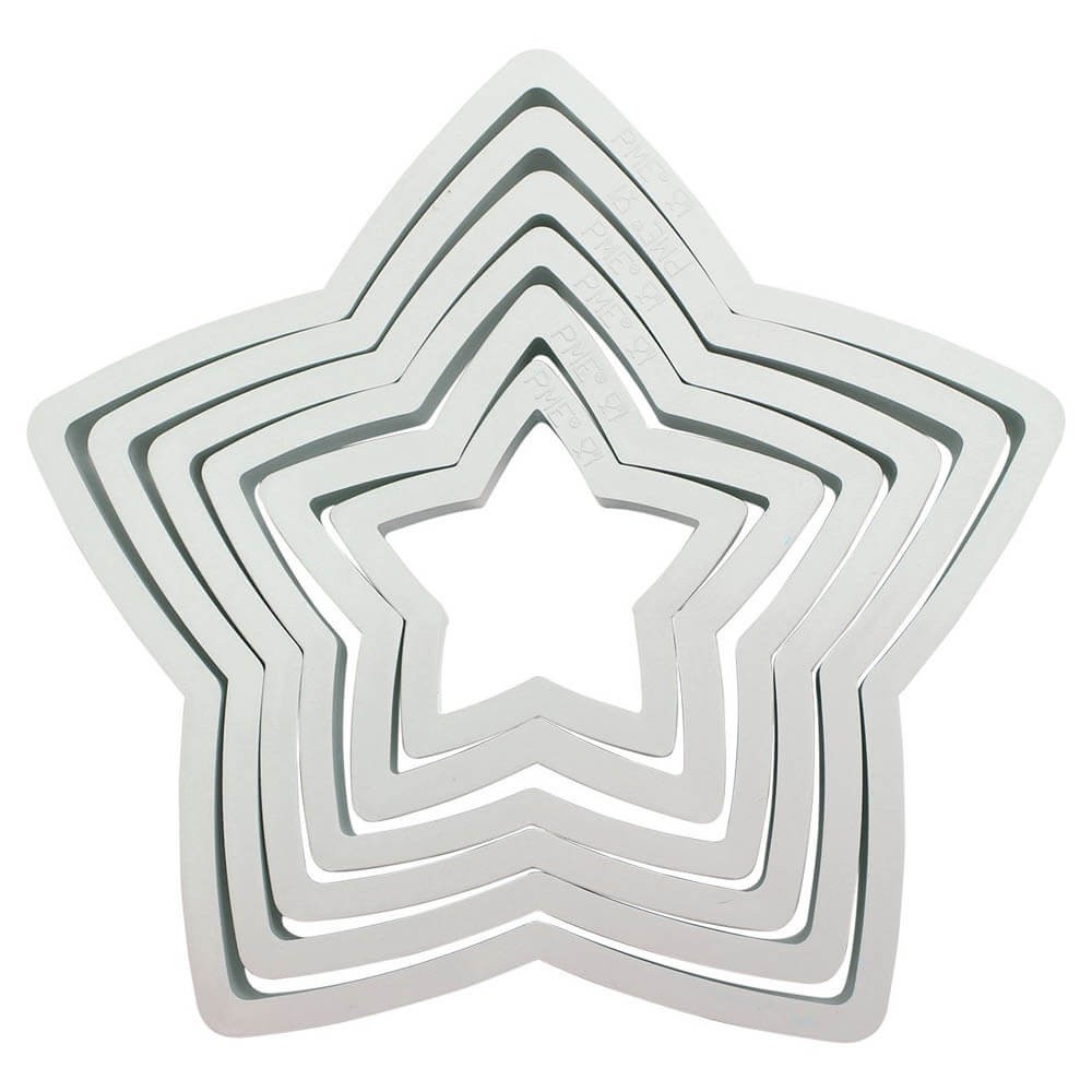 Juego de 6 cortadores de galletas en forma de estrella de la marca PME, fabricados en termoplástico ABS resistente de color blanco, fáciles de usar y limpia, perfectos para hacer galletas, pastas, placas y formas simples tanto dulces como saladas.