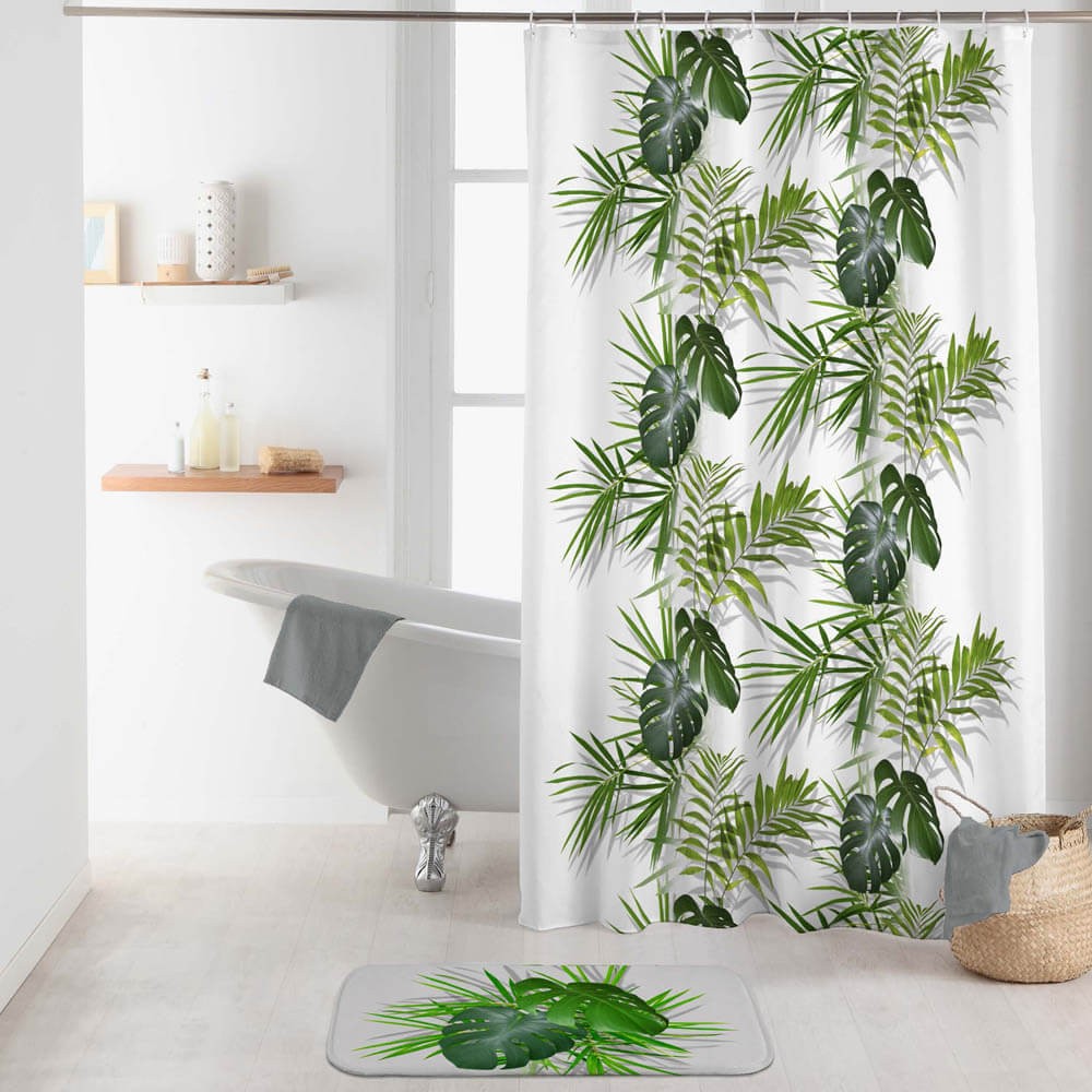 Cortina de baño diseño de estilo tropical decorada con hojas verdes sobre fondo blanco, ideal como cortina bañera o como cortina ducha para evitar que el agua se salga.