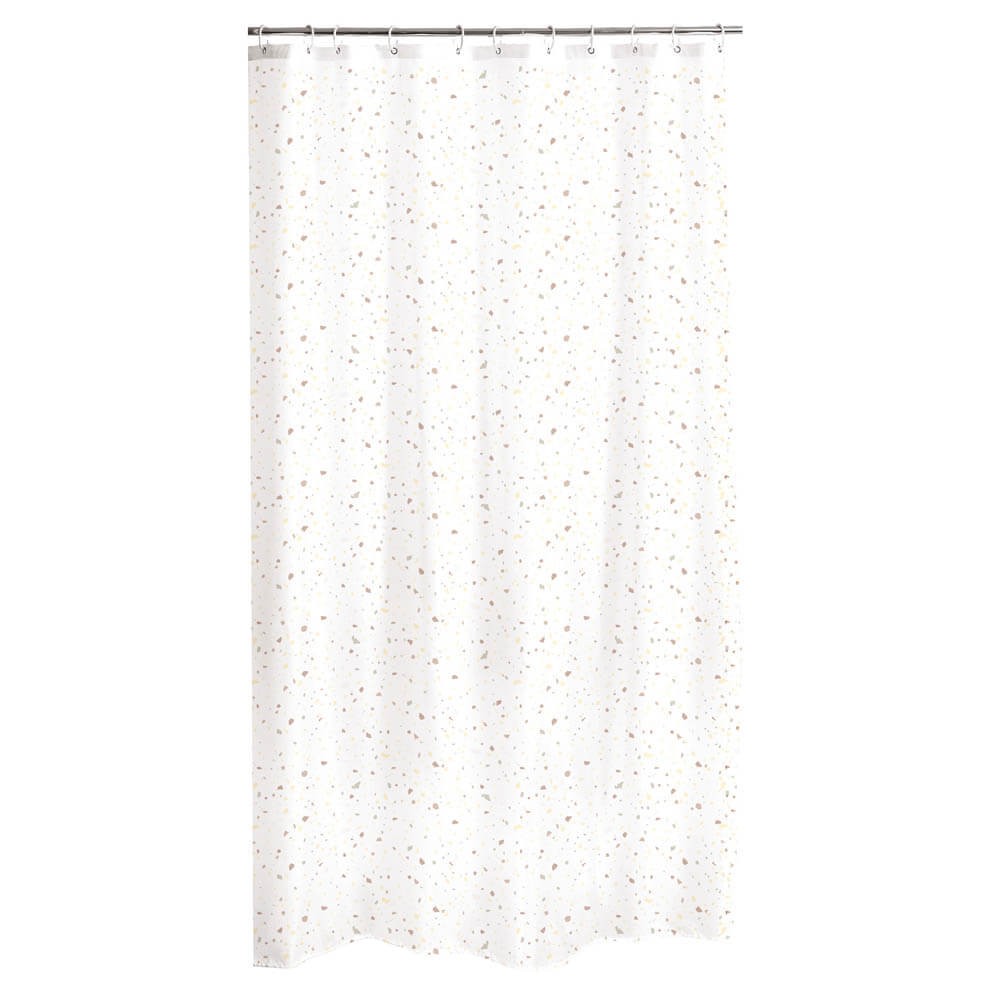 Cortina de baño original decorada con motas tipo mármol sobre fondo blanco, muy práctica como cortina bañera o cortina ducha para evitar que el agua se salga.