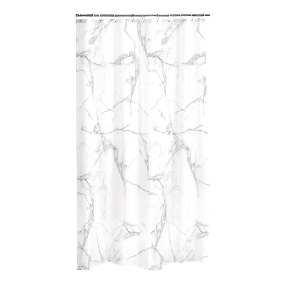 Cortina de baño diseño mármol confeccionada en tejido de poliéster estampado con tratamiento repelente e impermeable, ideal para colocar en la ducha o bañera y evitar que el agua salpique el suelo del baño.